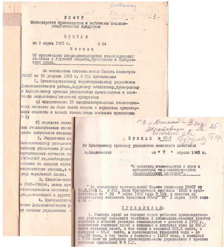 Во исполнение Постановления Совета Министров РСФСР от 18 февраля 1965 г. №252 издан Приказ Министерства производства и заготовок сельскохозяйственных продуктов РСФСР от 2 марта 1965 г. № 64 «Об организации специализированных пчеловодческих совхозов Амурской области, Приморском и Хабаровском краях».
